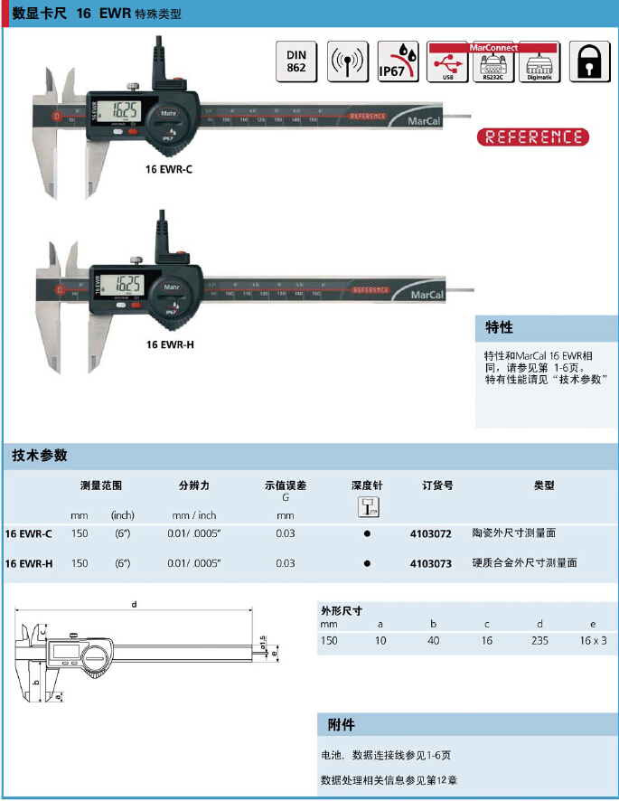 馬爾16EWR-C-H 數(shù)顯游標卡尺0-150X0.01mm 4103072規(guī)格參數(shù)Specs