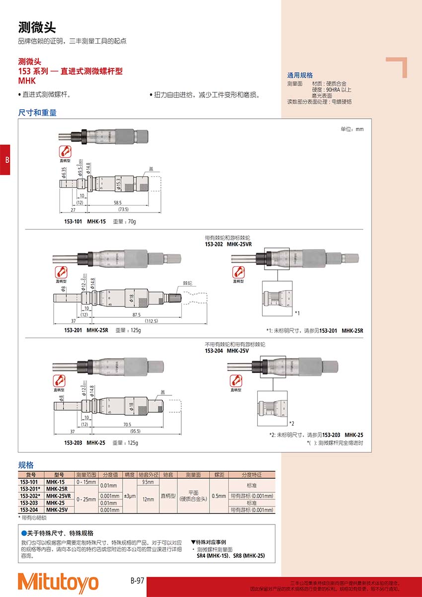 | 153-202* | MHK-25VR | 0 - 25mm | 0.001mm | 12mm | 直柄型 | (硬質(zhì)合金頭) | 帶有游標(biāo) (0.001mm) | ||