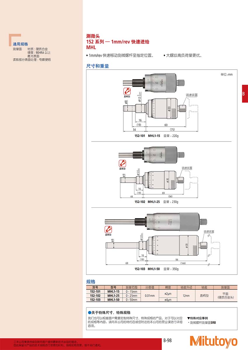 測(cè)微頭 152 系列 152-102規(guī)格參數(shù)Specs