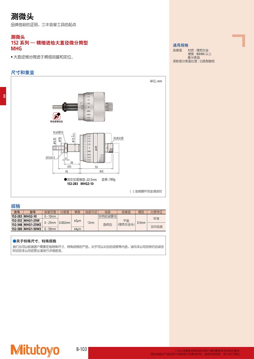 | 152-283 | MHG2-10 | 0 - 10mm | 帶有鎖緊螺母 | 標準 | |||||