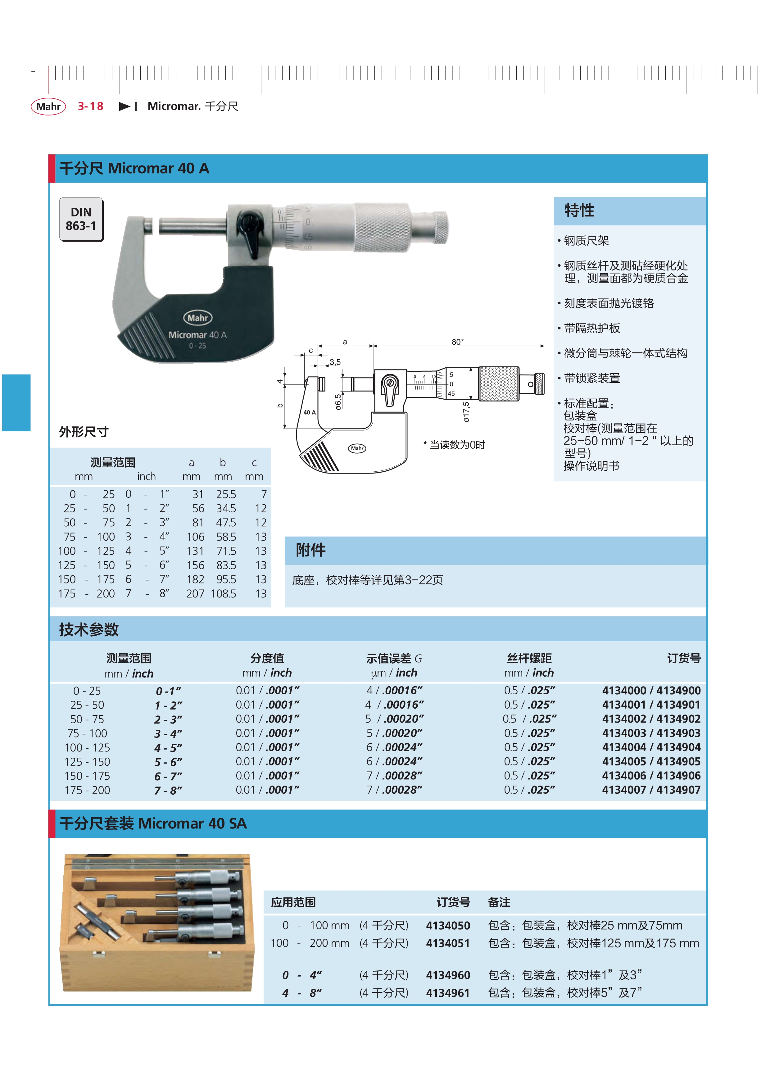 德國馬爾Mahr微分筒棘輪一體機械刻度千分尺40A2 - 3"(4134902)規(guī)格參數(shù)Specs