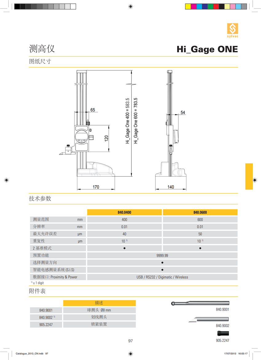 測高儀附件840.0400 Hi_Gage ONE規(guī)格參數(shù)Specs