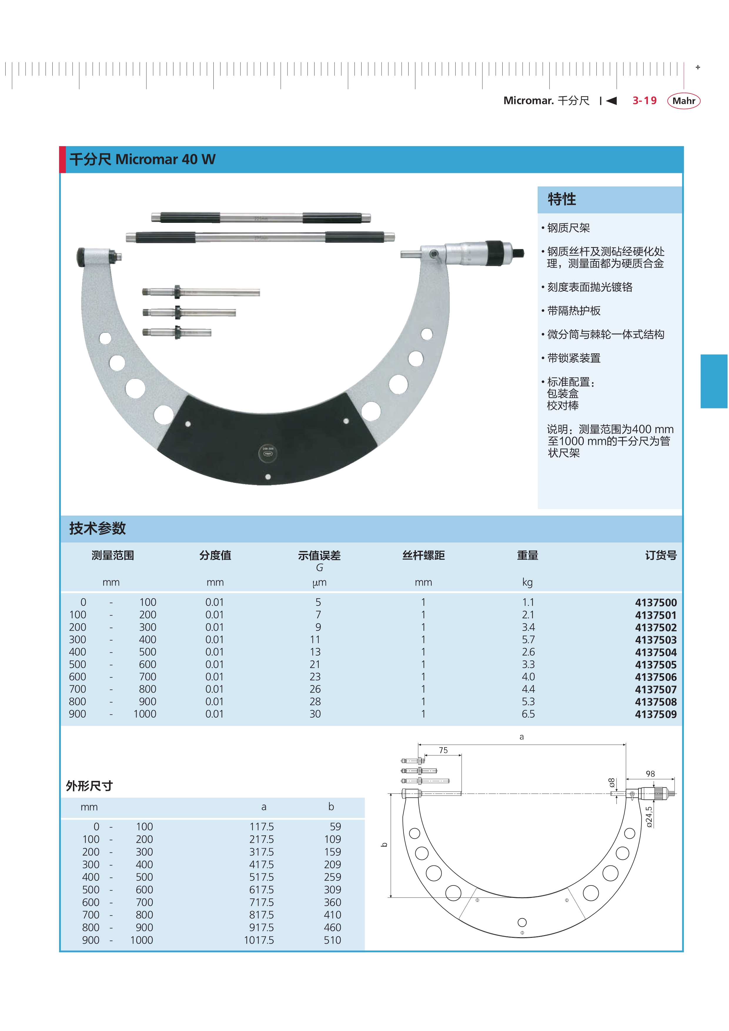 德國(guó)馬爾Mahr機(jī)械千分尺機(jī)械千分尺40W系列量程0-100mm4137506規(guī)格參數(shù)Specs