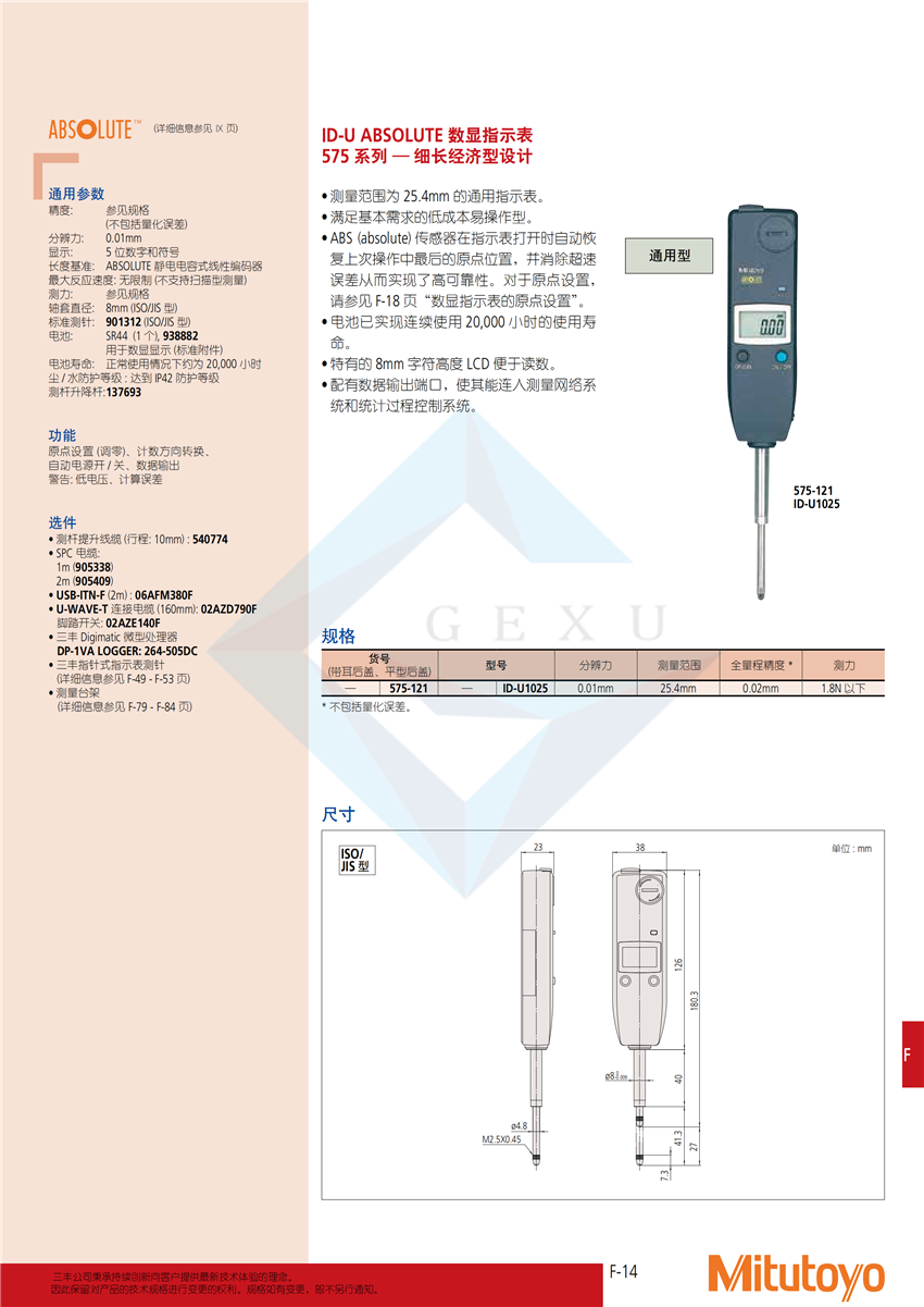 ? 測量范圍為25.4mm 的通用指示表。 ? 滿足基本需求的低成本易操作型。 ? ABS (absolute) 傳感器在指示表打開時自動恢 復上次操作中最后的原點位置,并消除超速 誤差從而實現了高可靠性。對于原點設置, 請參見F-18 頁“數顯指示表的原點設置”。 ? 電池已實現連續(xù)使用20,000 小時的使用壽 命。 ? 特有的8mm 字符高度LCD 便于讀數。 ? 配有數據輸出端口,使其能連入測量網絡系 統(tǒng)和統(tǒng)計過程控制系統(tǒng)。