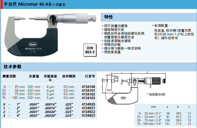 德國(guó)馬爾 千分尺40AB 小測(cè)量面 0-1"-2"-3"-4"mm 千分尺 4134923規(guī)格參數(shù)Specs
