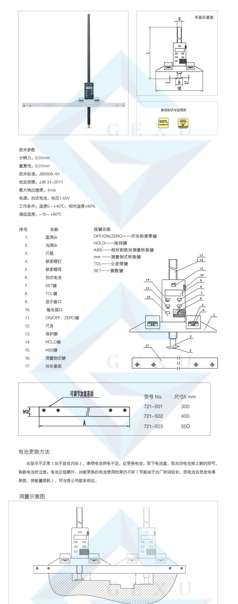 用于精確測量溝槽寬和溝槽位置尺寸、臺階深度;深度尺可以在加寬基面上移動,測量更方便;多種規(guī)格的加寬基面可供選擇;任意位置清零,便于相對測量與絕對測量轉換;帶數(shù)據(jù)保持功能;帶預置數(shù)功能;帶公差帶設置功能;任意位置公制與英制轉換;