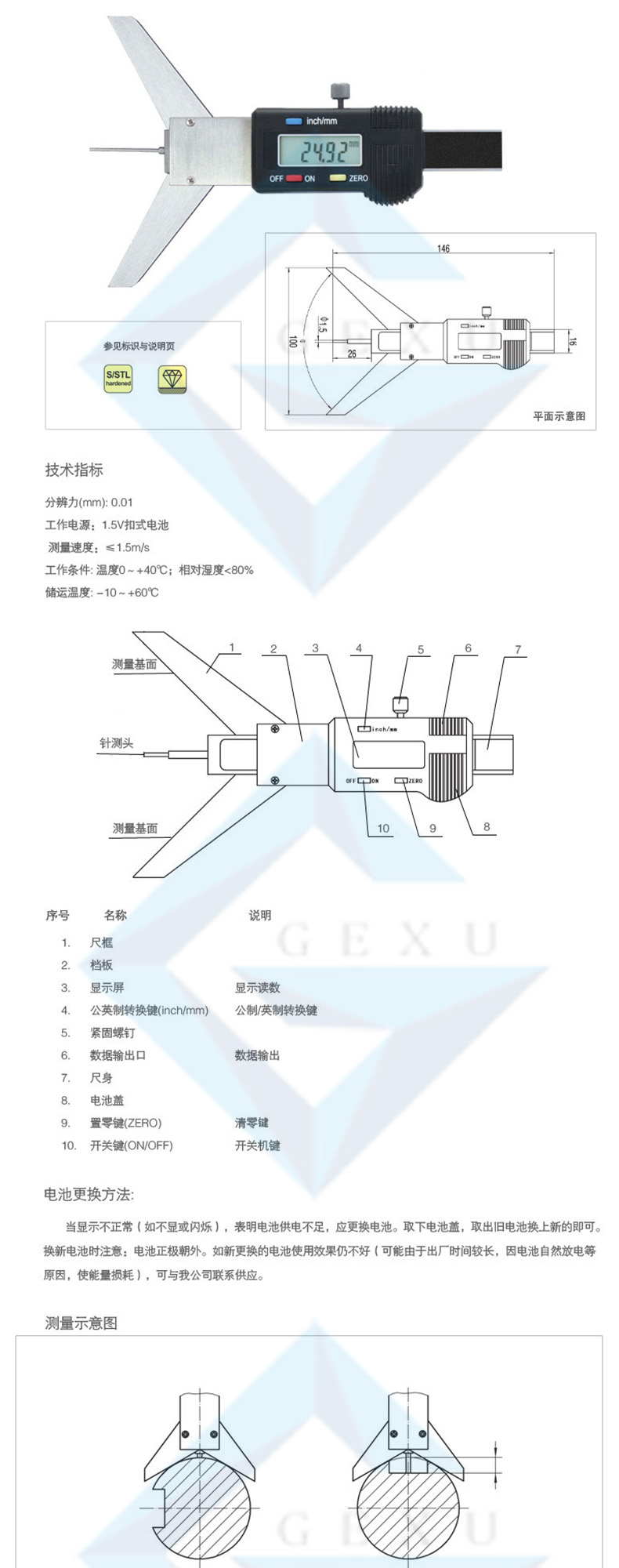 專用于測(cè)量各種軸上鍵槽深度,方便快捷;外形小巧,便于攜帶;任意位置清零,便于相對(duì)測(cè)量與絕對(duì)測(cè)量轉(zhuǎn)換;任意位置公制與英制轉(zhuǎn)換;