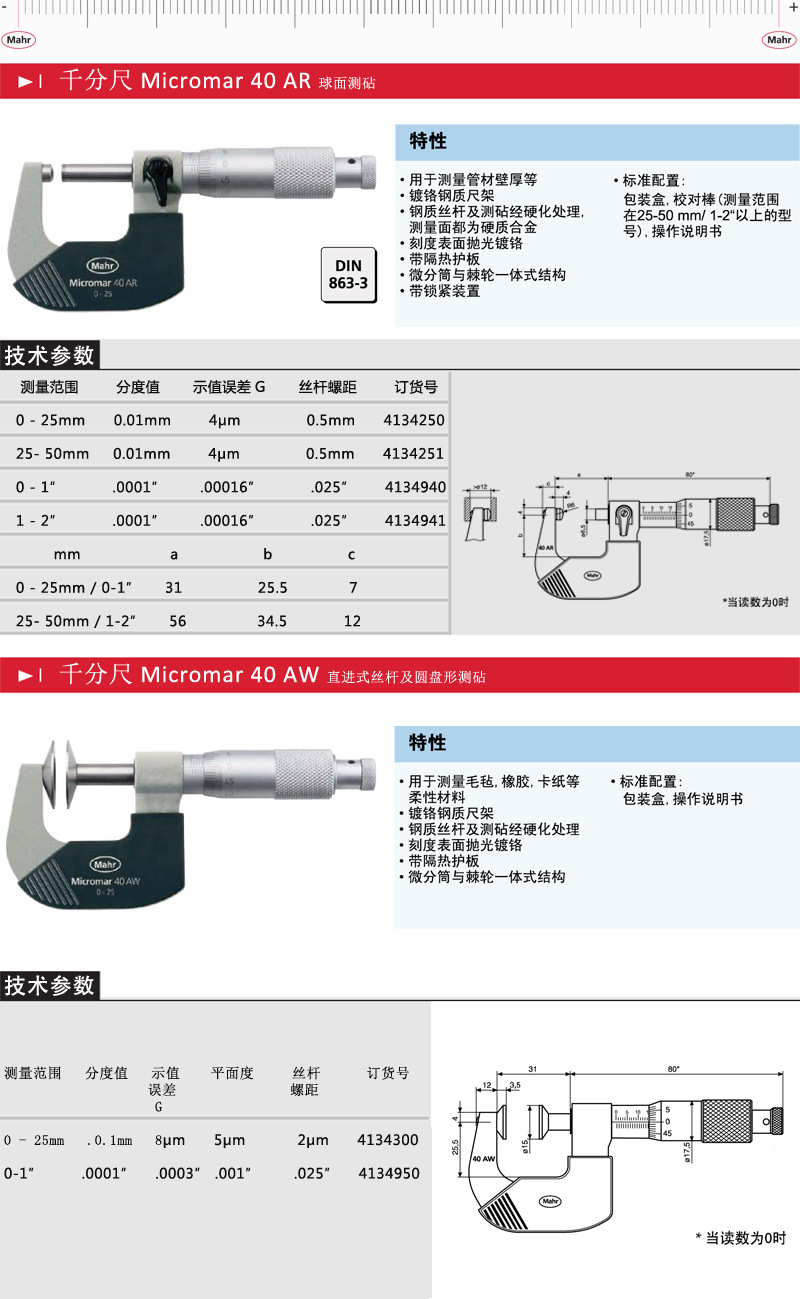 德國馬爾Mahr千分尺40AR 4134940 4134941 球面測砧 壁厚千分尺規(guī)格參數(shù)Specs
