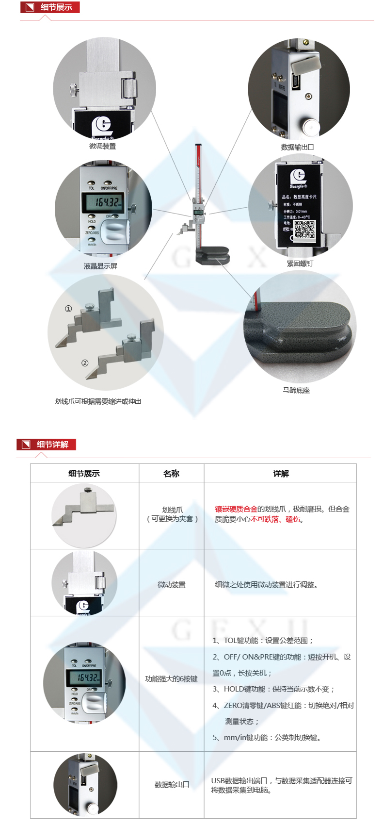 用于高度測量和劃線,帶電源開關(guān);任意位置清零,便于相對測量與絕對測量轉(zhuǎn)換,任意位置公制與英制轉(zhuǎn)換;帶數(shù)據(jù)保持功能;帶預(yù)置數(shù)功能;帶公差帶設(shè)置功能;帶有微調(diào)裝置;劃線爪鑲硬質(zhì)合金。