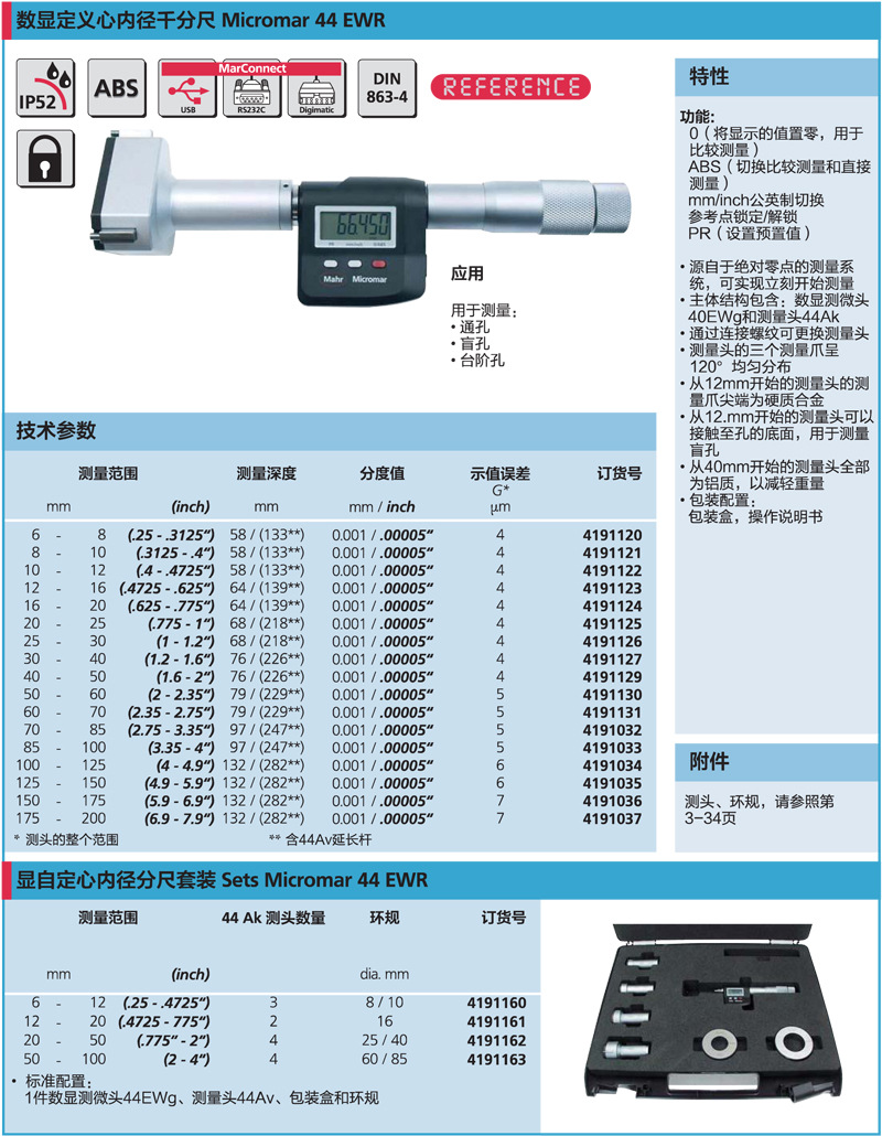 德國馬爾數(shù)顯自定心內(nèi)徑千分尺 44EWR 12--16mm 訂貨號4191123規(guī)格參數(shù)Specs
