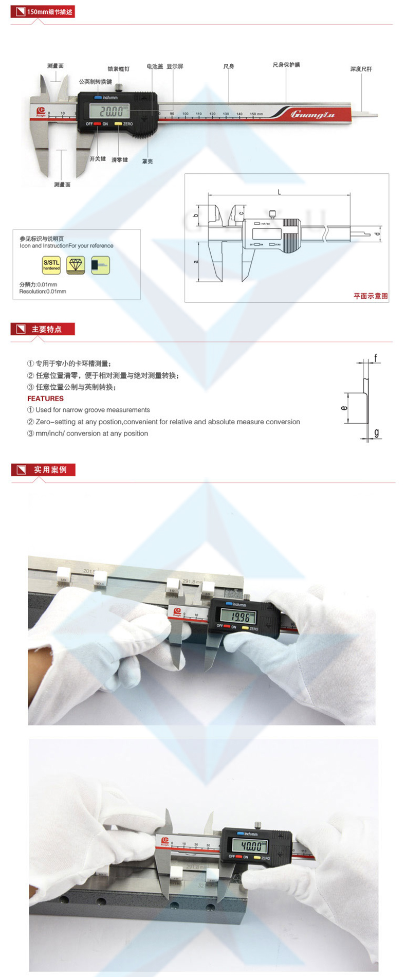 專用于窄小的卡環(huán)槽測量;任意位置清零,便于相對(duì)測量與絕對(duì)測量轉(zhuǎn)換;任意位置公制與英制轉(zhuǎn)換;