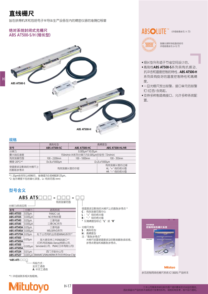絕對(duì)系統(tǒng)封閉式光柵尺100 - 2200mm、100 - 1000mm、100 - 350mmABS AT500-S/H規(guī)格參數(shù)Specs