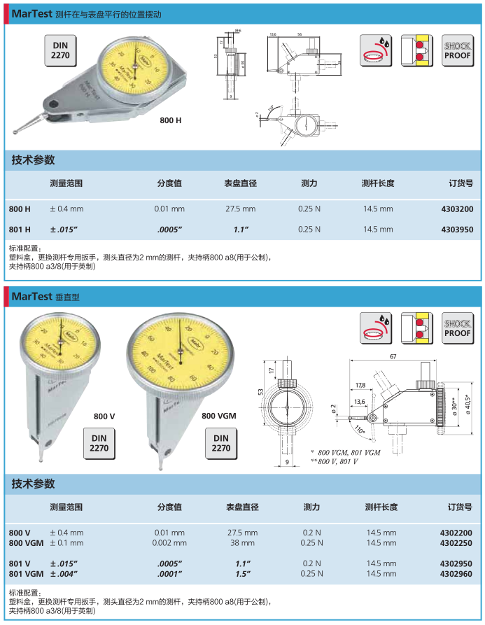 德國馬爾機(jī)械杠桿表 垂直型 800V 0.4mm 4302200 百分表規(guī)格參數(shù)Specs