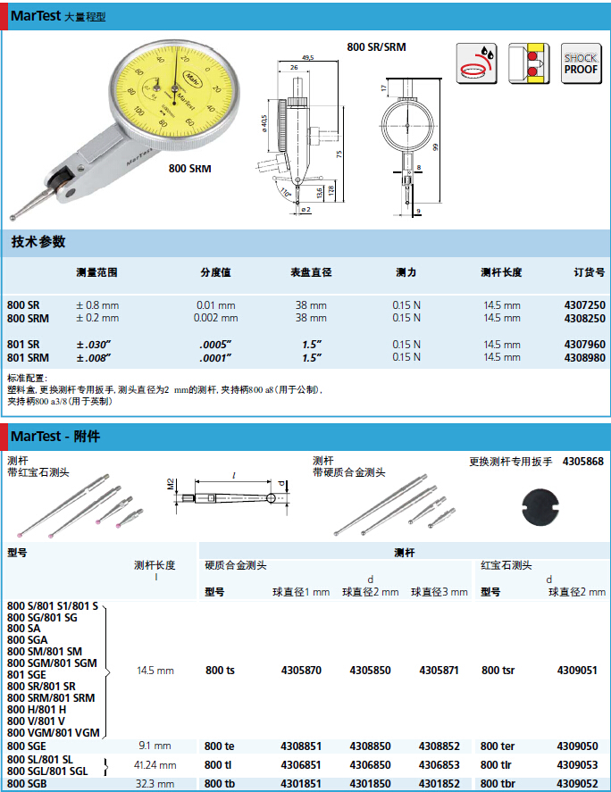 德國馬爾Mahr 大量程型杠桿表 800SR 0.8mm機(jī)械杠桿百分表4308250包裝清單Detail