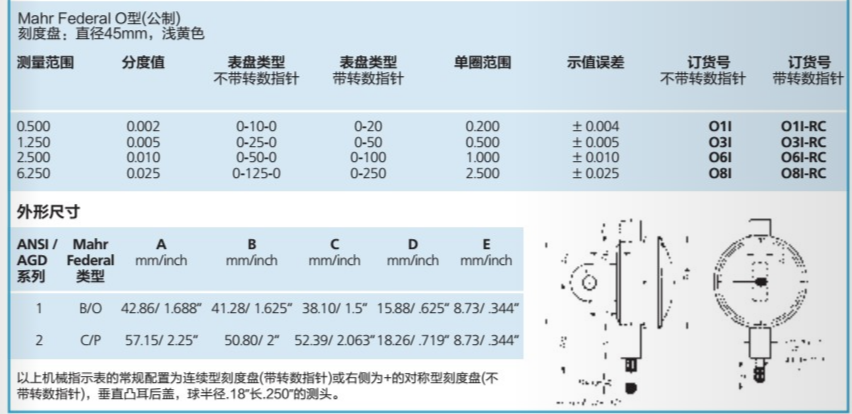 ANSI/AGD機(jī)械指示表1系列——Mahr Federal B型與O型 O3I 2011770規(guī)格參數(shù)Specs