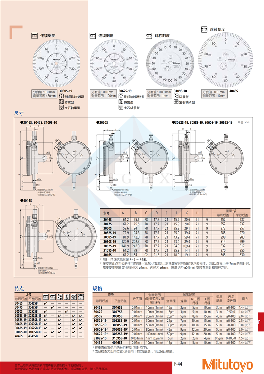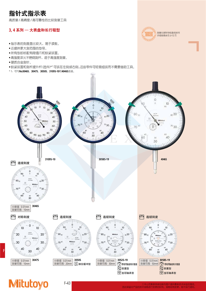 ? 指示表的刻度盤比較大,易于讀數(shù)。 ? 還提供更大測范圍的型號。 ? 所有型都標(biāo)配有限值爪和鎖緊裝置。 ? 高強度淬火不銹鋼測桿,適于高強度測量。 ? 硬質(zhì)合金測針。 ? 鎖緊裝置和測桿提升桿(選件)*1 可裝在左側(cè)或右側(cè),這些零件可輕易組裝而不需要借助工具。 * 1: 可與No3046S,3047S,3050S,3109S-10和4046S連接。