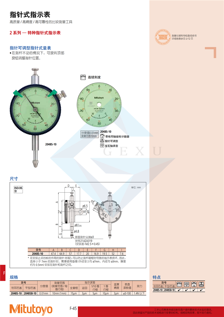 2 系列 — 特種指針式指示表 10mm (1mm) 2048S-10規(guī)格參數(shù)Specs