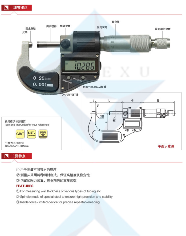 ① 用于測(cè)量不同管材的厚度 ② 測(cè)量頭采用特種鋼材制成,保證高精度及穩(wěn)定性 ③ 內(nèi)置式限力裝置,確保精確的重復(fù)讀數(shù)
