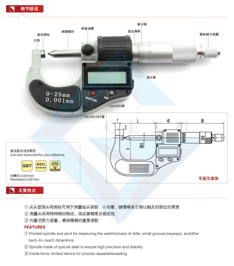單尖頭千分尺211-211測(cè)量0-25mm規(guī)格參數(shù)Specs