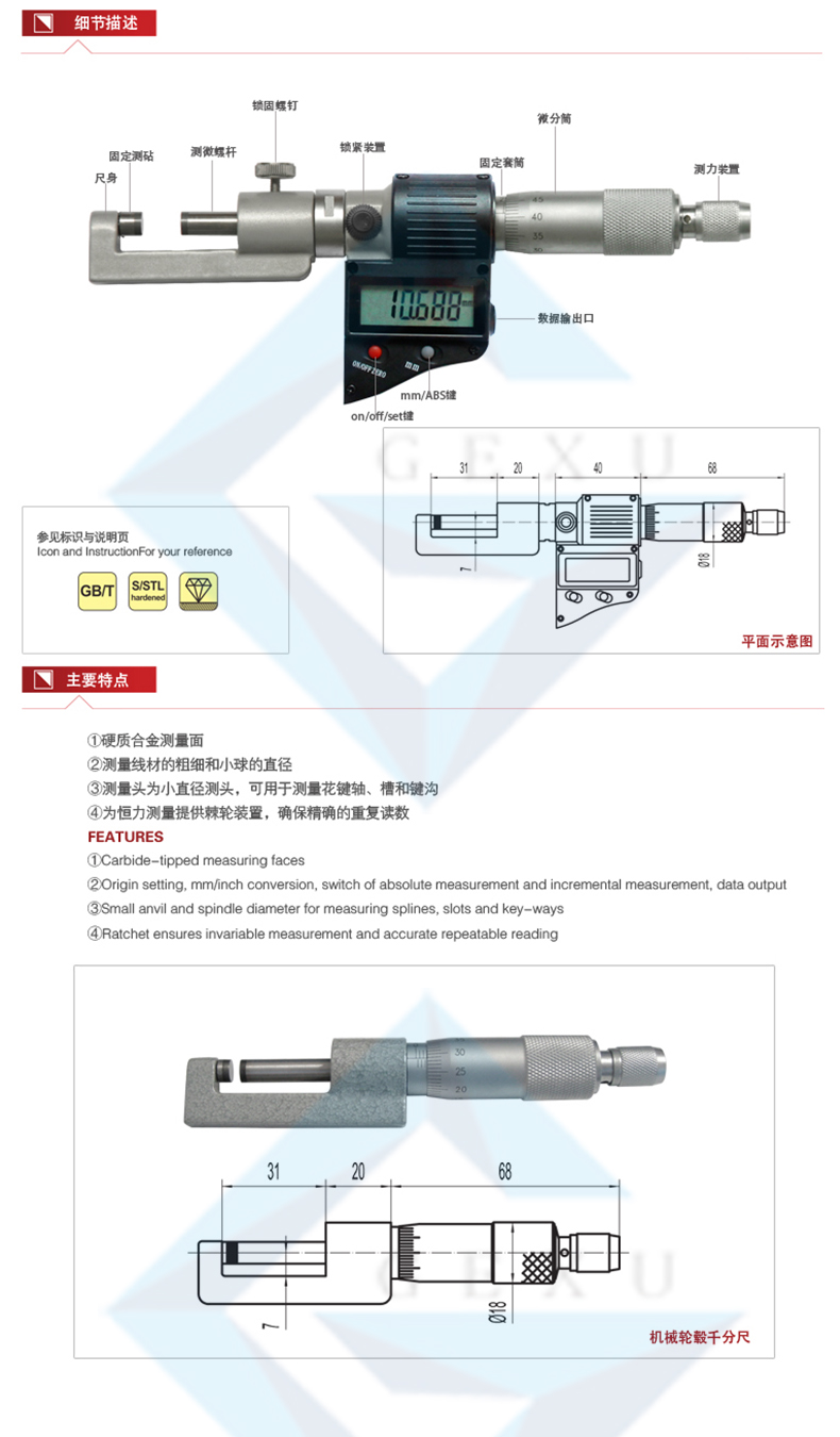 ① 硬質(zhì)合金測(cè)量面 ② 測(cè)量線材的粗細(xì)和小球的直徑 ③ 測(cè)量頭為小直徑測(cè)頭,可用于測(cè)量花鍵軸、槽和鍵溝 ④ 為恒力測(cè)量提供棘輪裝置,確保精確的重復(fù)讀數(shù)