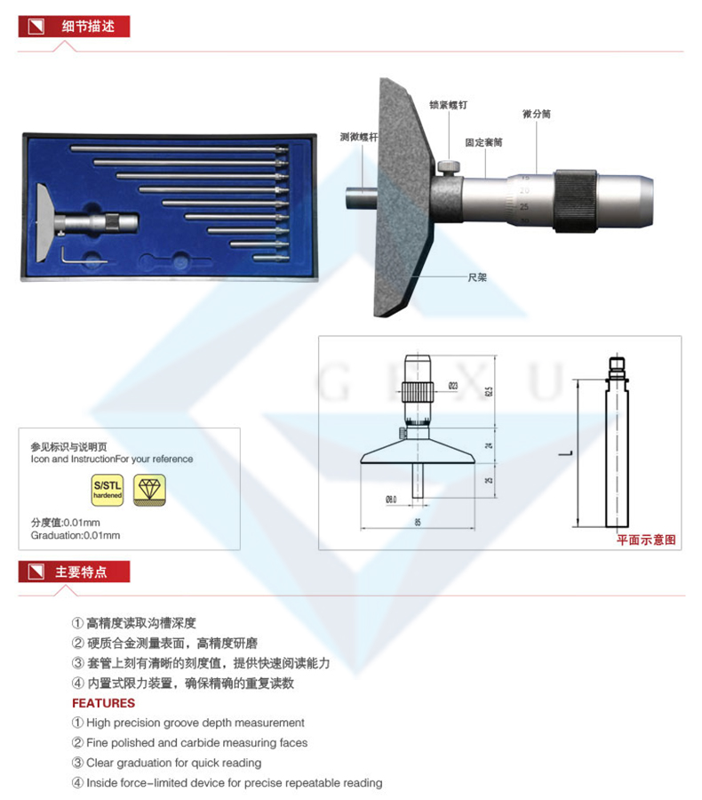 ① 高精度讀取溝槽深度 ② 硬質(zhì)合金測量表面,高精度研磨 ③ 套管上刻有清晰的刻度值,提供快速閱讀能力 ④ 內(nèi)置式限力裝置,確保精確的重復(fù)讀數(shù)
