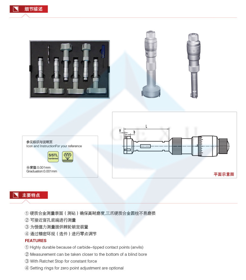 ① 硬質(zhì)合金測量表面(測砧)確保高耐磨度,三爪硬質(zhì)合金圓柱不易磨損 ② 可接近盲孔底端進(jìn)行測量 ③ 為恒值力測量提供棘輪鎖定裝置 ④ 通過精密環(huán)規(guī)(選件)進(jìn)行零點(diǎn)調(diào)節(jié)