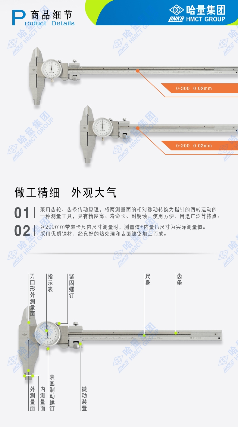 哈量機(jī)械帶表卡尺604A系列 高精度0-300mm 604A-05規(guī)格參數(shù)Specs
