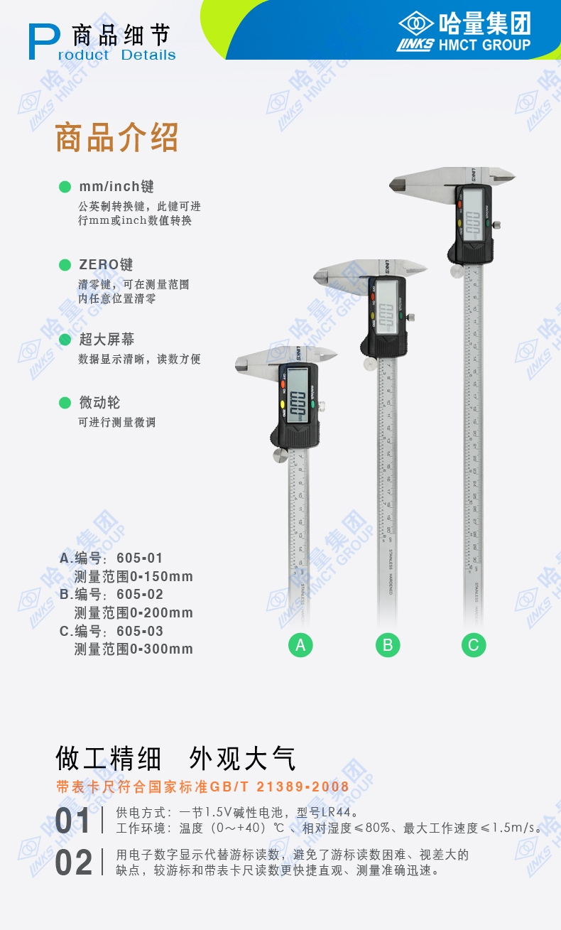 哈量電子數(shù)顯卡尺605系列 高精度0-150m 605-01規(guī)格參數(shù)Specs