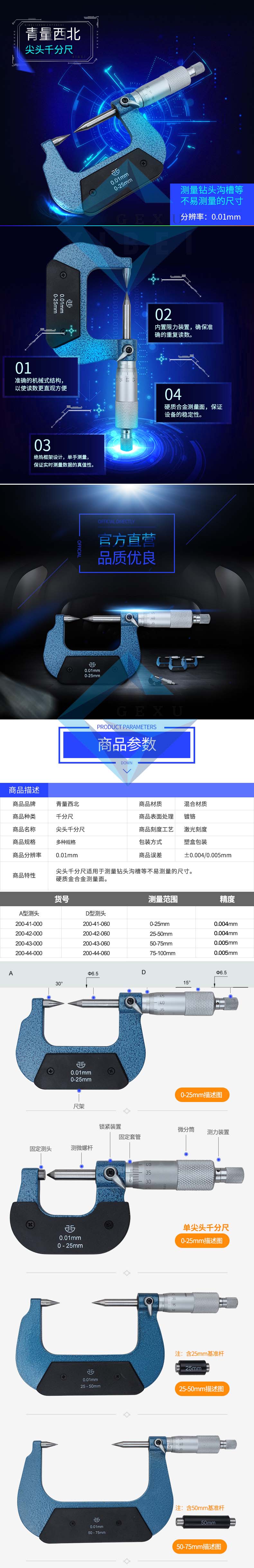 尖頭千分尺適用于測(cè)量鉆頭溝槽等不易測(cè)量的尺寸;硬質(zhì)合金測(cè)量面;分辨率:0.01mm