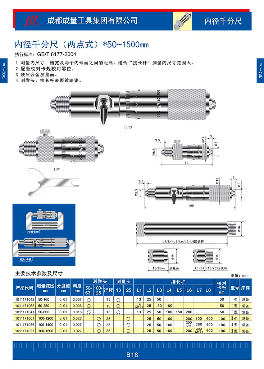 測(cè)量?jī)?nèi)尺寸、槽寬及兩個(gè)內(nèi)端面之間的距離。組合“ 接長(zhǎng)桿” 測(cè)量?jī)?nèi)尺寸范圍大。配備校對(duì)卡規(guī)校對(duì)零位。硬質(zhì)合金測(cè)量面。測(cè)微頭、接長(zhǎng)桿表面鍍暗鉻。