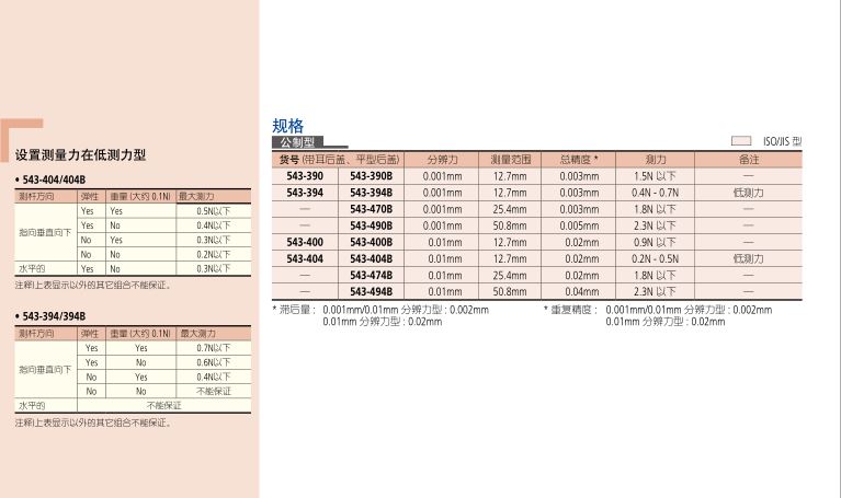 | 0.01mm | 543-404 | 543-404B | 12.7mm | 0.02mm | 0.2N - 0.5N | 低測力 |