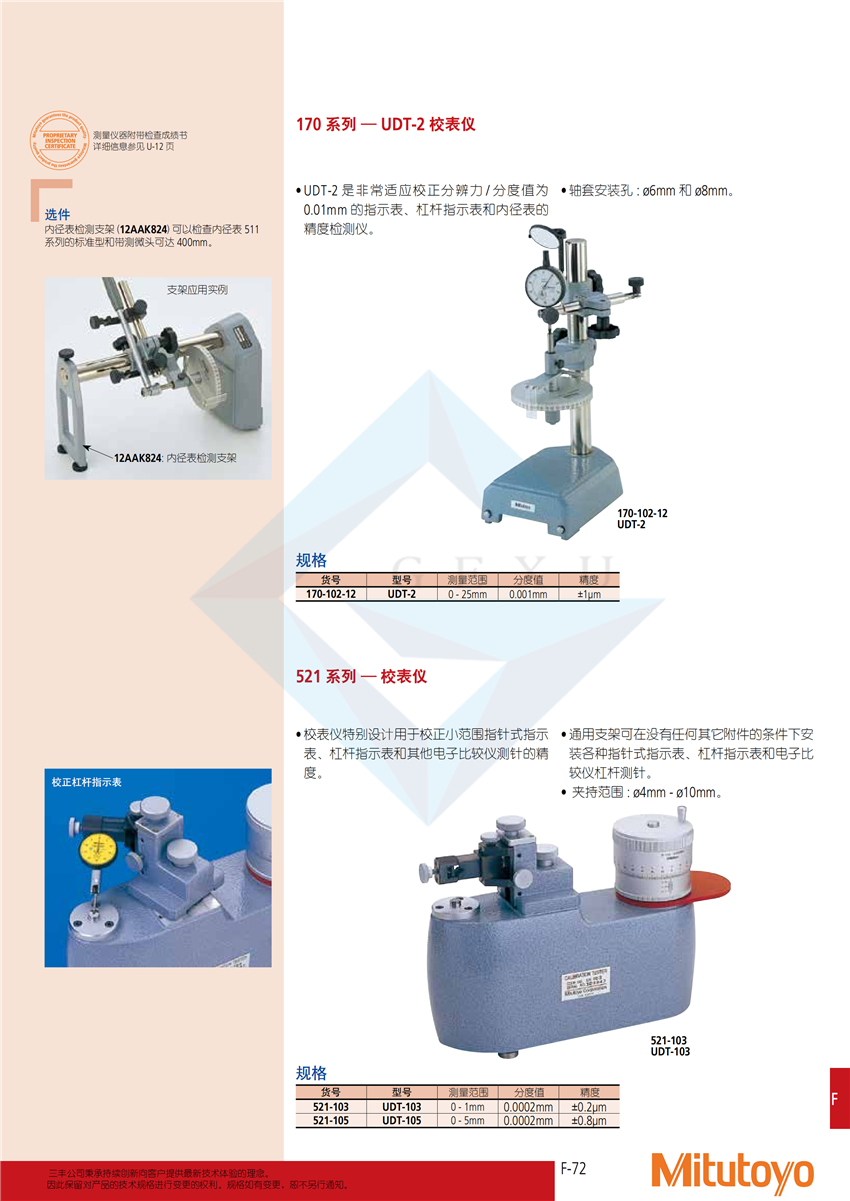 ? 校表儀特別設(shè)計(jì)用于校正小范圍指針式指示 表、杠桿指示表和其他電子比較儀測(cè)針的精 度。 ? 通用支架可在沒(méi)有任何其它附件的條件下安 裝各種指針式指示表、杠桿指示表和電子比 較儀杠桿測(cè)針。 ? 夾持范圍: ?4mm - ?10mm。