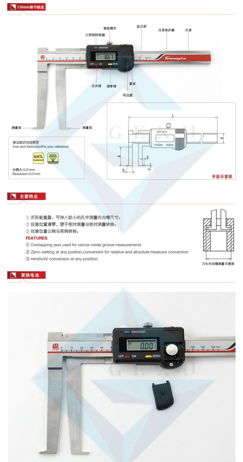 爪形能重疊,可伸入較小的孔中測量內(nèi)溝槽尺寸;任意位置清零,便于相對測量與絕對測量轉(zhuǎn)換;任意位置公制與英制轉(zhuǎn)換;