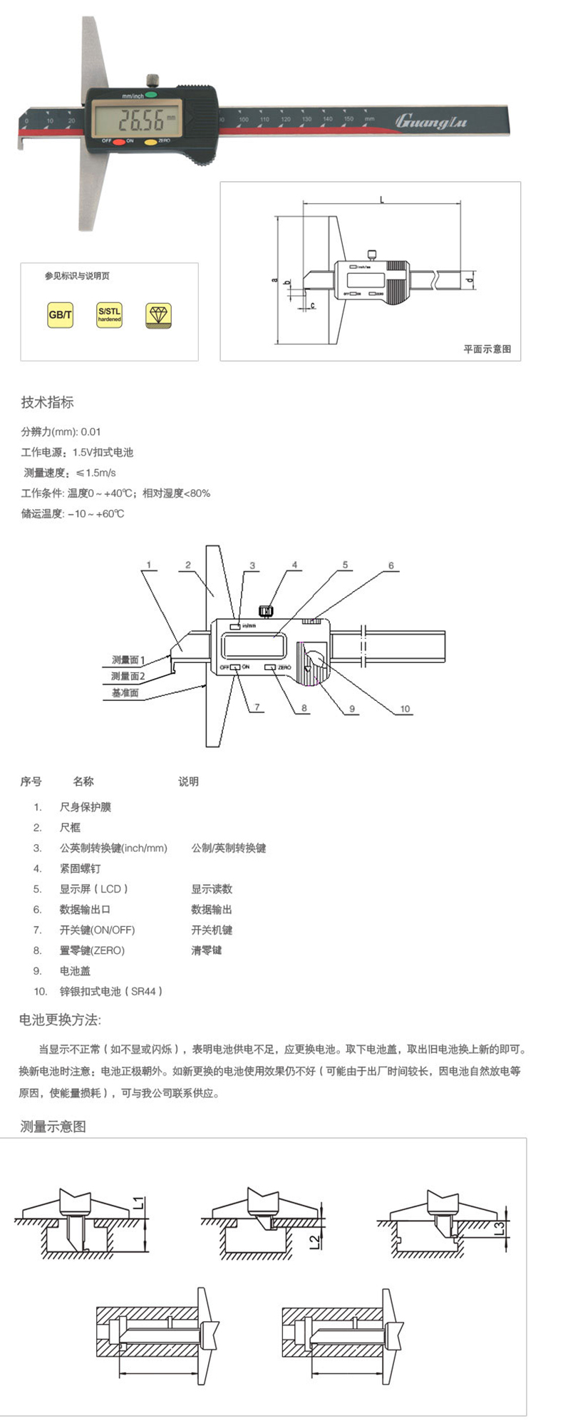 單鉤頭數(shù)顯深度尺123-104測(cè)量0-300mm規(guī)格參數(shù)Specs