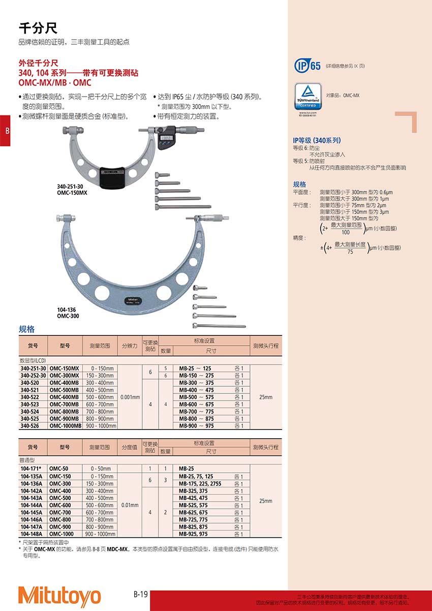 通過更換測(cè)砧,實(shí)現(xiàn)一把千分尺上的多個(gè)寬度的測(cè)量范圍。測(cè)微螺桿測(cè)量面是硬質(zhì)合金 (標(biāo)準(zhǔn)型)