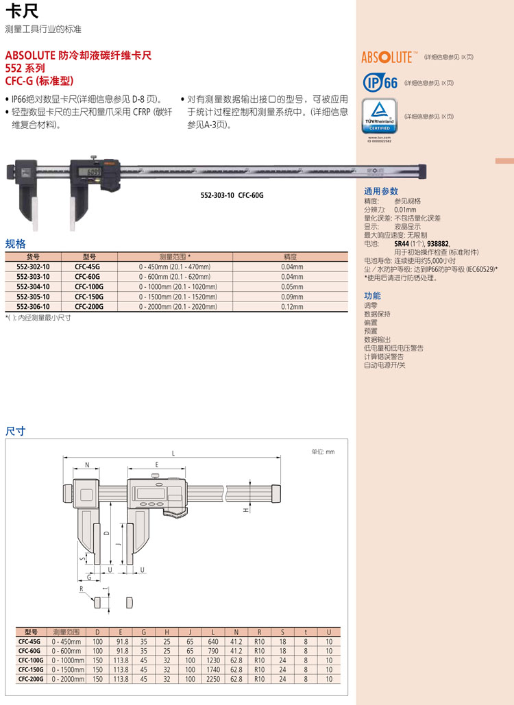 防冷卻液碳纖維卡尺1000mm,552-304規(guī)格參數(shù)Specs