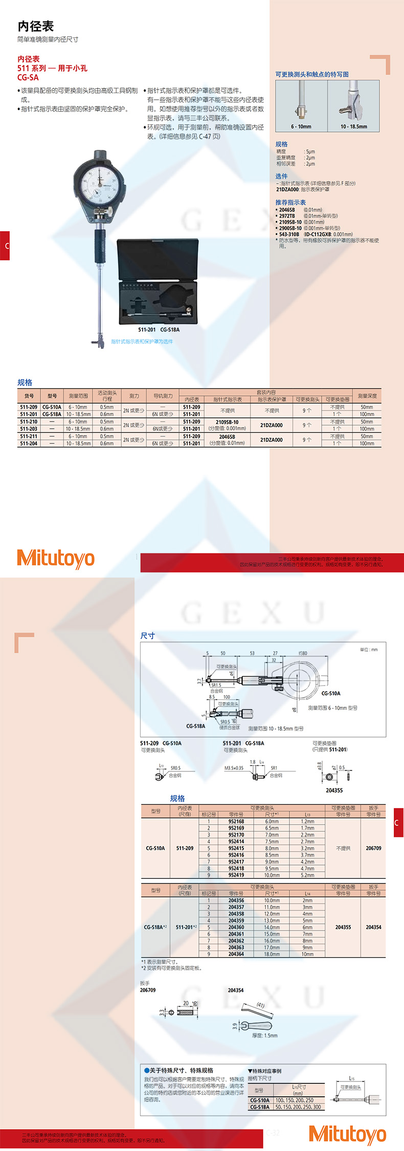 內(nèi)經(jīng)表511-210,測(cè)量6 - 10mm規(guī)格參數(shù)Specs