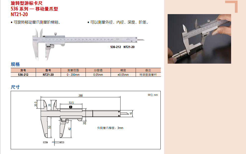 旋轉(zhuǎn)型游標(biāo)卡尺0-200mm 536-212規(guī)格參數(shù)Specs