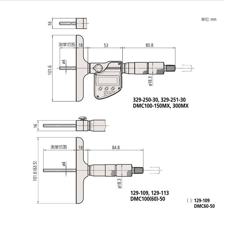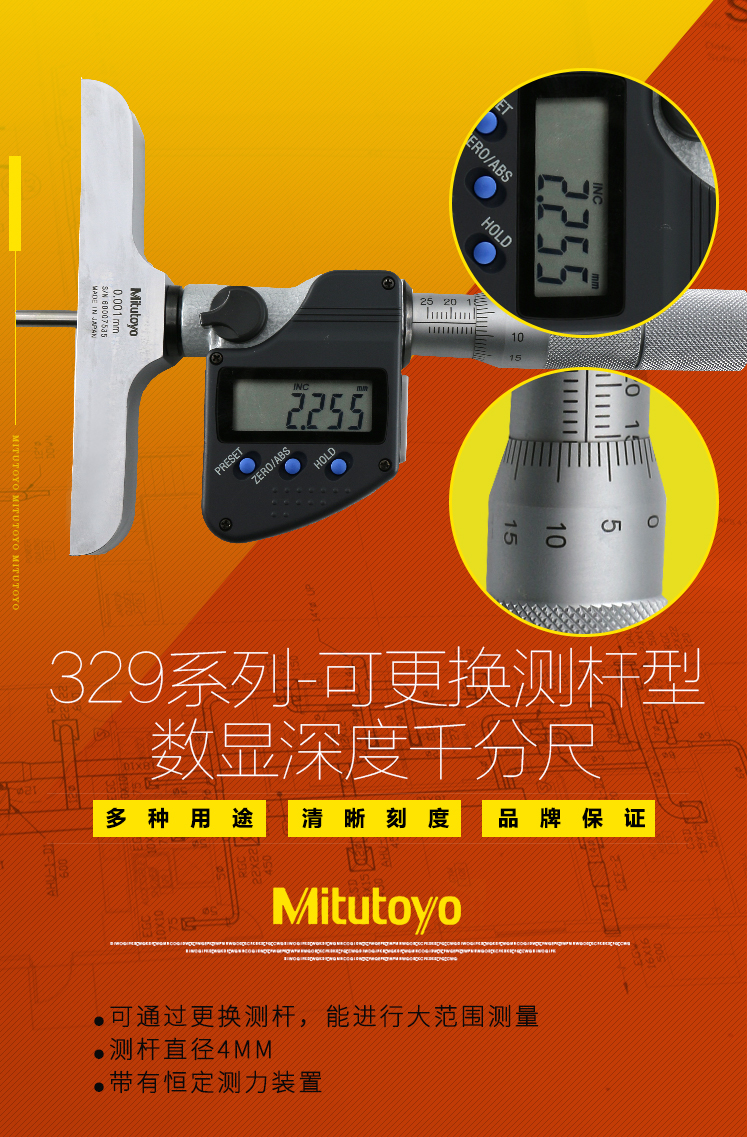 三豐深度數(shù)顯電子千分尺329-251-10 0--300mm深度尺0.001mm規(guī)格參數(shù)Specs
